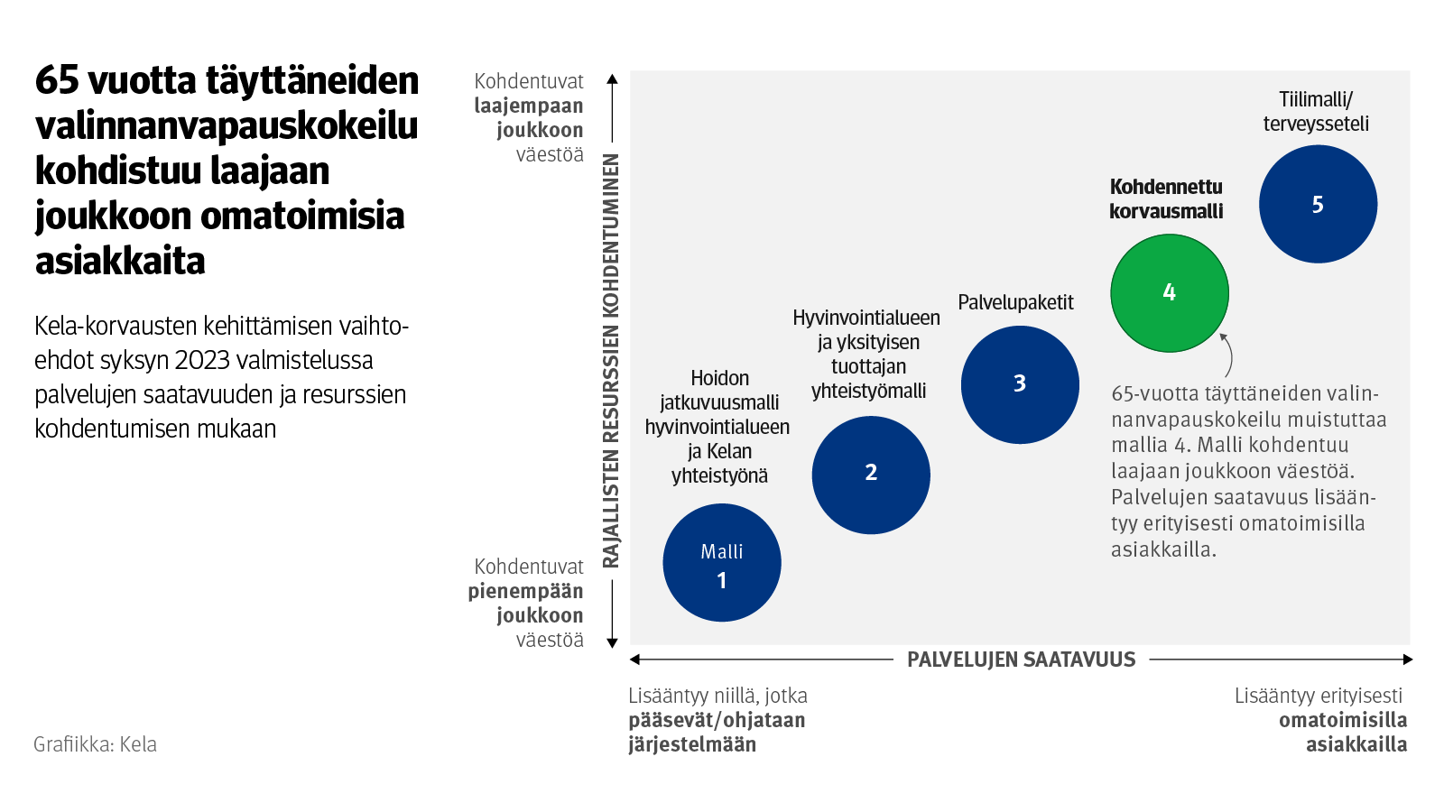Syyskuussa alkaneen 65 vuotta täyttäneiden valinnanvapauskokeilun taustalla on täyskäännös Kela-korvausten pidemmässä kehityskulussa. Loppuvuodesta 2023 viisi erilaista mallia oli pöydällä korvausten kehittämiseen. Valittu malli on suurin kehittämisponnistus Kela-korvausjärjestelmässä vuosikymmeniin.