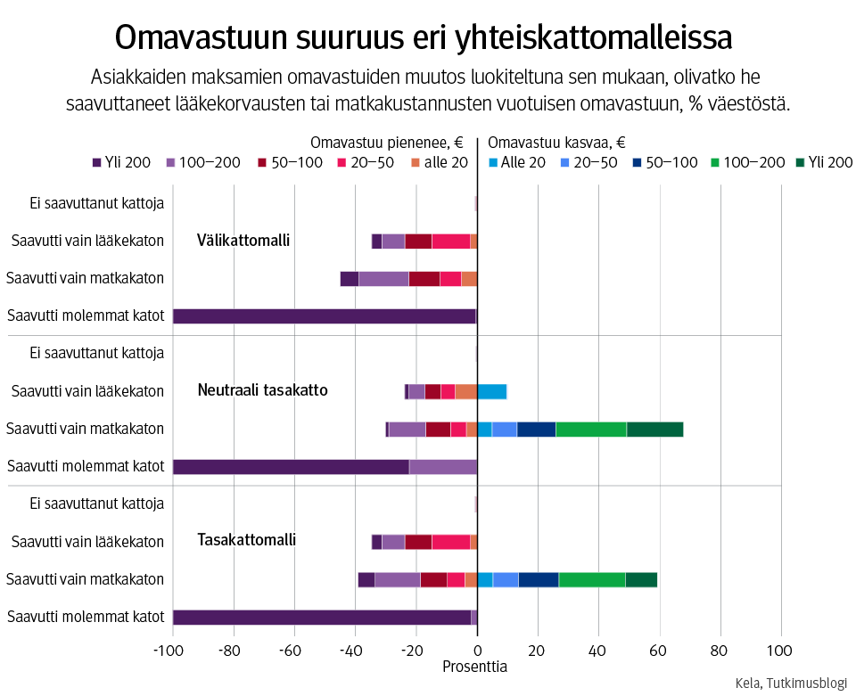 Lääke- ja matkakaton yhdistäminen ei sinänsä liene realistinen vaihtoehto, mutta niiden avulla pystyy arvioimaan erilaisia tapoja muodostaa yhteiskatto eri suuruisille vuosikatoille ja arvioimaan vaikutuksia.