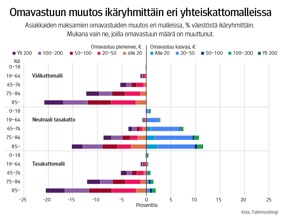 Kuvio 3. Asiakkaiden maksamien omavastuiden muutos eri malleissa, % väestöstä ikäryhmittäin. Mukana vain ne, joilla omavastuun määrä on muuttunut.