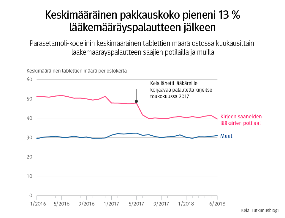 Kela lähetti keväällä 2017 ensimmäistä kertaa korjaavaa palautetta lääkäreille, jotka olivat aloittaneet uuden potilaan lääkehoidon liian suurella pakkauksella opioidia. Miten kirje muutti lääkärien toimintaa?