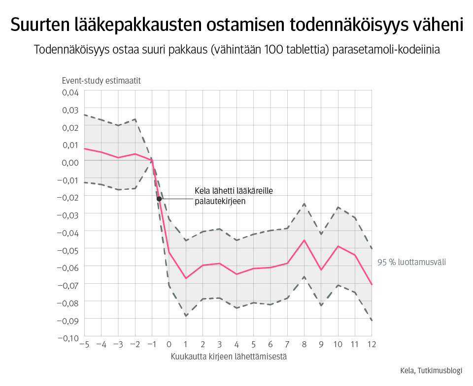 Keskimääräinen pakkauskoko pieneni 12,5 prosenttia (Kuvio 1). Suurten, yli 100 tabletin pakkausten, ostamisen todennäköisyys väheni 6 prosenttiyksikköä, mikä tarkoittaa 37,5 prosentin vähenemistä verrattuna ennen kirjeen lähettämistä havaittuun keskiarvoon (Kuvio 2).