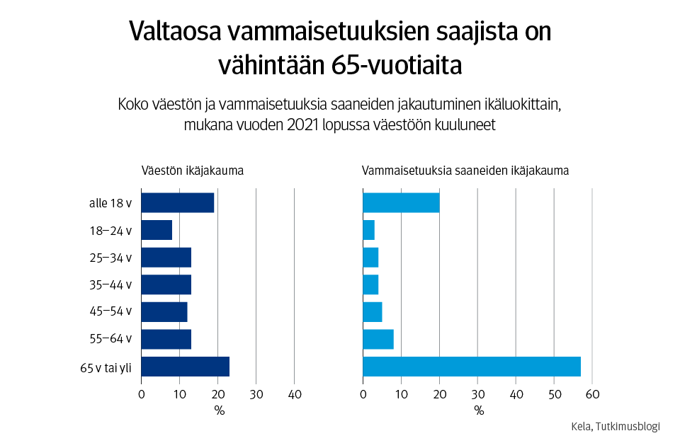 Vammaisetuuksien saajien ikärakenne eroaa selvästi muusta väestöstä. Valtaosa vammaisetuuksien saajista on vähintään 65-vuotiaita. Noin viidennes vammaisetuuksien saajista on alle 18-vuotiaita ja työikäisiä (18–64-vuotiaita) on niin ikään noin viidennes. (Kuvio 1.)